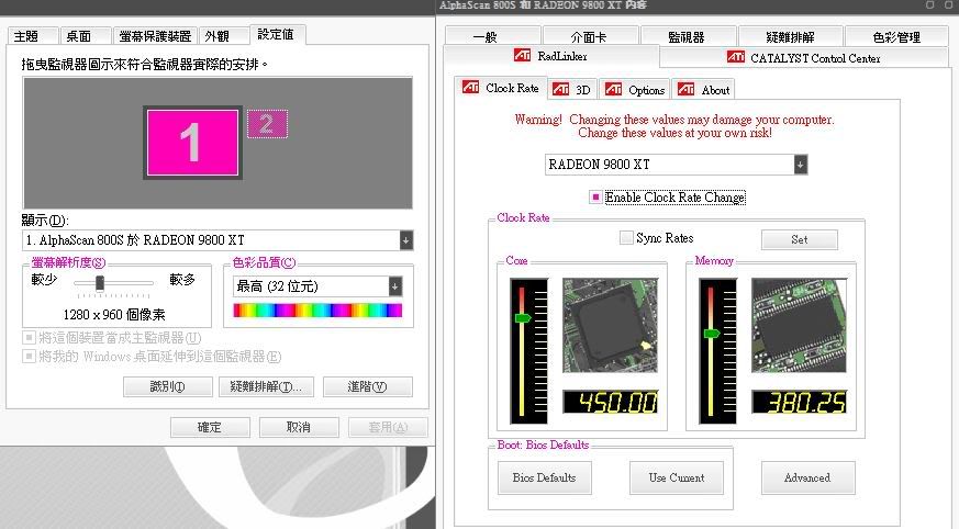 所以就想說看看舊的控制介面還能不能用... 開啟了 "顯示內容->設定值->進階" 結果..."進階"按鈕一按下去... 啪...重開機...試了兩次都一樣...乖乖換回4.8版...我是用Win2000...:P |