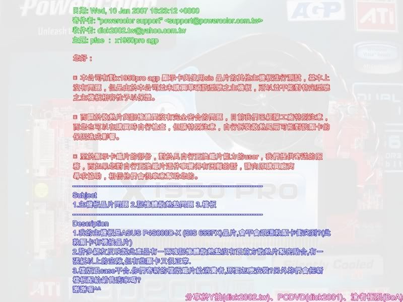 精星的x1950pro 不好嗎? 為何賣掉換 powercolor的? 好奇..... 另可否告知....您的橋接晶片是用散熱膏+ 記憶體散熱片(黏在保護墊) 還是3M散熱貼紙來黏的? 引用: