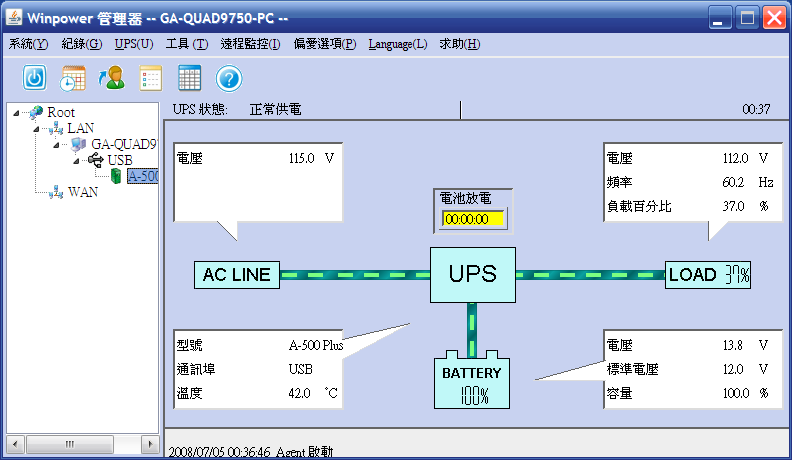 ![]() 飛瑞UPS監控軟體說的接主機+5 port HUB+Cable Modem+創新2.1喇叭+BenQ FP222WH 正常使用狀態,待機大約在34% ![]()