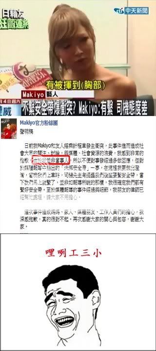我敢說.到時一堆X忠幫的節目.一定拼命發她通告 然後這些媒體就變成Makiyo的發聲管道... 然後就打人事件變成藝人間的閒談八卦... 過一陣子風頭過了..還有人關心誰被打嗎... 酒照喝.趴照跑然後看看那一個司機是下一個倒楣蛋... |