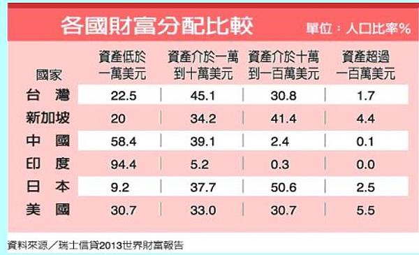 3000萬剛好是一百萬美元,根據瑞士信貸2013統計大約占台灣人口1.7% ![]() |