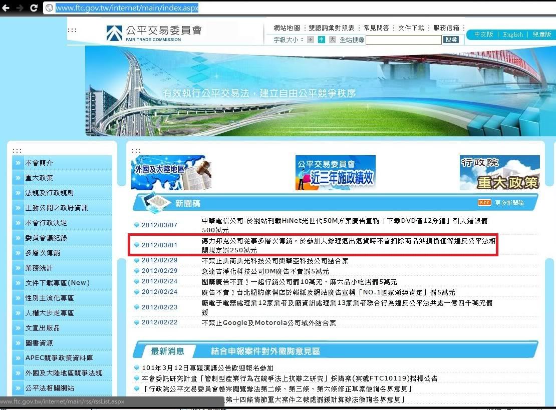 蓬勃發展是嗎?? 進去首頁第一頁就看到 http://www.ftc.gov.tw/internet/main/index.aspx ![]() 好棒阿 真是太美好了 這種公司太多了 所以才把傳直銷弄的一鍋臭 99年 多層次傳銷事業營運發展狀況線上查報結果報告 相信一定有人懶得看又臭又長的報告 直接切到重點 (三)參加人數及參加人人數規模: 1.參加人數:99 年底參加人數計 572.6 萬人次,較 98 年底 556.6 萬人次,增加 16 萬人次。剔除重複計算人數,估算 99 年底參加人數為 457.0 萬人,較 98 年底 444.2 萬人增加 12.8 萬人。 2.99 年新加入之參加人:共計 82.09 萬人,占參加人總數 14.34%,較 98 年之新 加入參加人 76 萬人,增加 6.09 萬人,比率上升 0.69 個百分點。 3.女性參加人為傳銷市場主力:99 年底女性參加人計 390.4 萬 人,較 98 年底 338.9 萬人,增加 51.5 萬人;99 年底女性參加人占總參加人比率 68.18%,較 98 年之 60.89%,則上升 7.29 個百分點。 4.實際參與傳銷活動參加人比率:參加人實際參與傳銷活動比率在 40%以上之事 業占全體多層次傳銷家數之 25.68%,顯示多層次傳銷參加人實際參與傳銷比率 並不高,但仍較 98 年參加人數實際參與比率達 40%以上事業之比率 18.88%提 升 6.8 個百分比。 (四)加入傳銷率:99 年底加入傳銷率 19.73%,即平均每百人中有 19.73 人參加多層 次傳銷活動,較 98 年底 19.21%,上升 0.52 個百分點。 (六)事業參加人人數規模:99 年參加人總數為 572.6 萬人,平均每家參加人人數為 1.73 萬人,較 98 年底 1.84 萬人,減少 1.1 千人(減 5.98%)。觀察參加人人數 規模,以參加人 1 千人未及 1 萬人之事業最多,計 136 家(占 41.09%),其次是 未及 1 千人之事業,計 125 家(占 37.76%),1 萬至未及 5 萬人之事業,計 42 家 (占 12.69%)再次之,而參加人人數在 10 萬人以上之事業有 14 家,顯見參加人 人數規模大小甚為懸殊。 (十)領取佣(獎)金人數:99 年曾領取佣(獎)金之參加人計 81.9 萬人,占參加人 總數 14.30%。平均每人獲得佣(獎)金 2 萬 8,277 元,較 98 年 2 萬 9,819 元減 少 1,542 元。 你現在的觀點就如同當初那些上線講的話一樣 而我前面也說過 這世界上正常運作 長長久久的公司 都是以銷售產品為主 擴張(拉下線)為輔 拉人下線的台灣傳直銷公司一定會扯7-11,黃金M,趨成是 講說他們的模式是傳直銷 它們做這麼大都這麼做 所以傳直銷是趨勢 人家賣的都是正常的產品,7-11一天賣掉100萬隻飲料 也沒看他們一年開100萬間阿! 引用: