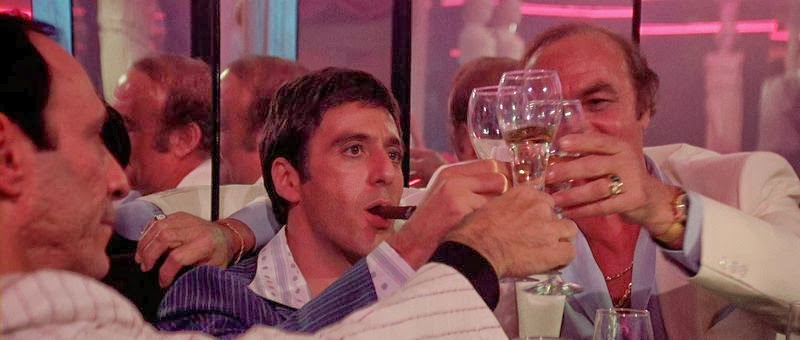 ![]() 他以為擁有了全世界就能改變,但他其實一直都是這個不公平的世界的奴隸。 邁阿密,這裡是充滿機會的城市,這裡有所有一切最美好的事物,只要你有實力、有膽量來贏取,這一切都將會拜倒在你的腳下,就像是征服了最美麗的女人一樣。 ![]() 首次觀看本片,深深受到前兩個小時的Tony Montana崛起過程的震撼。描寫他如何一再地利用機會證明自己的能耐,從一個洗碗工搖身一變成為邁阿密角頭Frank身邊的第二號人物,然後再更進一步擊敗Frank,成為邁阿密當地權傾一時的古柯鹼梟雄。 ![]() 這段故事相當過癮、精彩,然而之後的故事卻急轉直下,權傾一時的Tony很快就身處在危機四伏的險境。在各式各樣的內憂外患下,這時的Tony反而不若奮力爬上高位時那樣吸引人,頹敗的Tony看得令人坐立難安,無法想像不到半小時前的那個充滿雄心壯志的戰士這麼快就墮落到這樣的境地,Tony的最後奮戰顯得相當地無奈、無力。 ![]() 再次觀看本片時,從中感受到了新的氣氛。前面三分之二的崛起劇情鋪成都是為了突顯Tony在最後的戰鬥,強烈對比出Tony是如何一步步走進這個絕境。他的成功就和他的失敗一樣,都是因自於他自身,成功是必然的、失敗也是必然的。但還不僅於此,還有更深刻的,對這個世界的真實面貌的描寫,不只是Tony,很多人最終都不得不臣服其腳下,可是很少人能像Tony這樣,為自己必然來到的失敗命運,奮戰到最後一刻。 ![]() The World Is Yours 世界,本片提供了相當多的篇幅強調這一點。而The World Is Yours這句話更是在片中不斷以不同的形式出現。 ![]() Tony離開古巴、來到美國,就是為了尋求一個能讓他大展手腳的新舞台,他深信美國、邁阿密就是他追求的樂園。邁阿密,這個城市就是他要征服、奪取的世界,因為在這個世界中,有他所渴望的一切。Tony用了一個對他而言相當貼切的方式來形容邁阿密。 ![]() Tony : This is paradise, I’m tellin’ ya. This town like a great big pussy just waiting to get fucked. (我告訴你,這裡是天堂。這個城市就像個女人等著人去征服她。) 對Tony而言,這個城市充滿了機會,只要敢伸手去拿,就會是你的。而他,Tony是一個來自古巴的鄉巴佬,沒受過教育,也沒有人脈,但是他懂得如何在街頭生存,他有膽識、決心和不怕死,他要奮力一搏,向其他人證明。他,Tony也可以混出一番事業,不會被人永遠踩在腳下。 ![]() 特別是要向他的媽媽和妹妹證明,他可以像個男人一樣,賺到很多錢回來,讓媽媽和妹妹變成有錢人,再也不用看人臉色,而且有尊嚴地走在街上,因為Tony是一個被很多人尊敬的人。 ![]() Tony的特質 無庸置疑,Tony出自於貧窮的街頭,因此他很懂得街頭的生存方式,而且他夠講義氣,有誠信、有原則,不背叛朋友、說到做到,就算對方是他討厭的人也一樣。 Tony: All I have in this world is my balls and my word and I don’t break them for no noe. (在這個世界上,我有的就是我的膽量和承諾,而且我絕對不會為了任何人背棄這一切。) ![]() 因為他這股直接、不拐彎的性格,加上他敢衝、敢拼的行事作為,很快他就為自己在Frank面前打出漂亮的一仗。一場和哥倫比亞人的交易,雖然Tony已經有備而來,但在邁阿密這個地盤上,Tony仍算是新人,所以還是吃了哥倫比亞人的虧,損失了一個人。 ![]() 但是,靠著Tony那堅毅不屈的性格,撐到了援兵來救,一舉逆轉情勢。這裡又展現出了Tony那殘酷的一面,有仇必報、以血還血,而且必定是加倍奉還的街頭法則。 ![]() 面對逃出的那個哥倫比亞人,他毫不猶豫就以處決的方式,在光天化日下直接行刑,非常的兇悍和暴力。這一幕也直接地把本片的暴力面貌展現地淋漓盡致。 ![]() 談到暴力,要回頭看一下Tony在本片的首次殺人。這場刺殺行動雖是買兇殺人,但是也表明了其中是含有Tony在古巴時的舊恨發洩,而且也很清楚地展現Tony有仇必報的原則。 ![]() Frank的告誡 Tony的膽量和勇氣讓Frank見識到了此人在這行會是相當有力的幫手,會是一個強而有力,可以用來嚇阻其他人的猛獸。然而,Frank也很清楚Tony不是一個願意甘居下位的人。從Tony強烈要求要親自把從哥倫比亞人手中搶來的貨和Frank的錢交給Frank這一點就能看出來,Tony對於自己打拼出來的成果絕對不會拱手讓給任何人。 ![]() Tony不只有膽量去拼,更有野心去奪取屬於他的成功,他不會甘願把自己的成功讓給老大,替老大扛轎。所以,Frank在引Tony入這行時就先告誡了他兩件事。 Frank: Lesson number one: Don’t underestimate the other guy’s greed. (第一課,不要低估其他人的貪心。) Elvira: Lesson number two: Don’t get high on your own supply. (第二課,不要用自己的貨。) ![]() Frank對Tony說的,不要低估他人的貪心,其實就是在說Tony,Tony的貪心遲早會成為禍害。而Elvira說的,不要用自己的貨,也是在指貪心這件事,但是是指過度沉迷於自己創造出來的虛幻。 ![]() Sosa的誘惑 從Frank對Sosa的顧忌,可以推測Sosa的勢力比Frank大,而且資本也雄厚很多。對Sosa來說,他有能力穩定產出大量、高品質的古柯鹼,而他只需要一個經銷商幫他推向北美市場。 ![]() Sosa本來計劃是要和Frank接洽,然而Frank並未親自現身,而是派了Tony和Omar前來做有限度的洽談,這和Sosa期望的相去太遠。不過,卻也讓Sosa發現Tony的野心夠大,足夠作為他銷往北美的馬前卒。 ![]() 這場洽談有一段戲,就是Sosa指控Omar其實是警方線人,當場就處決他,而且還把處決過程表演給Tony看。一方面宣示他的手段夠很、一