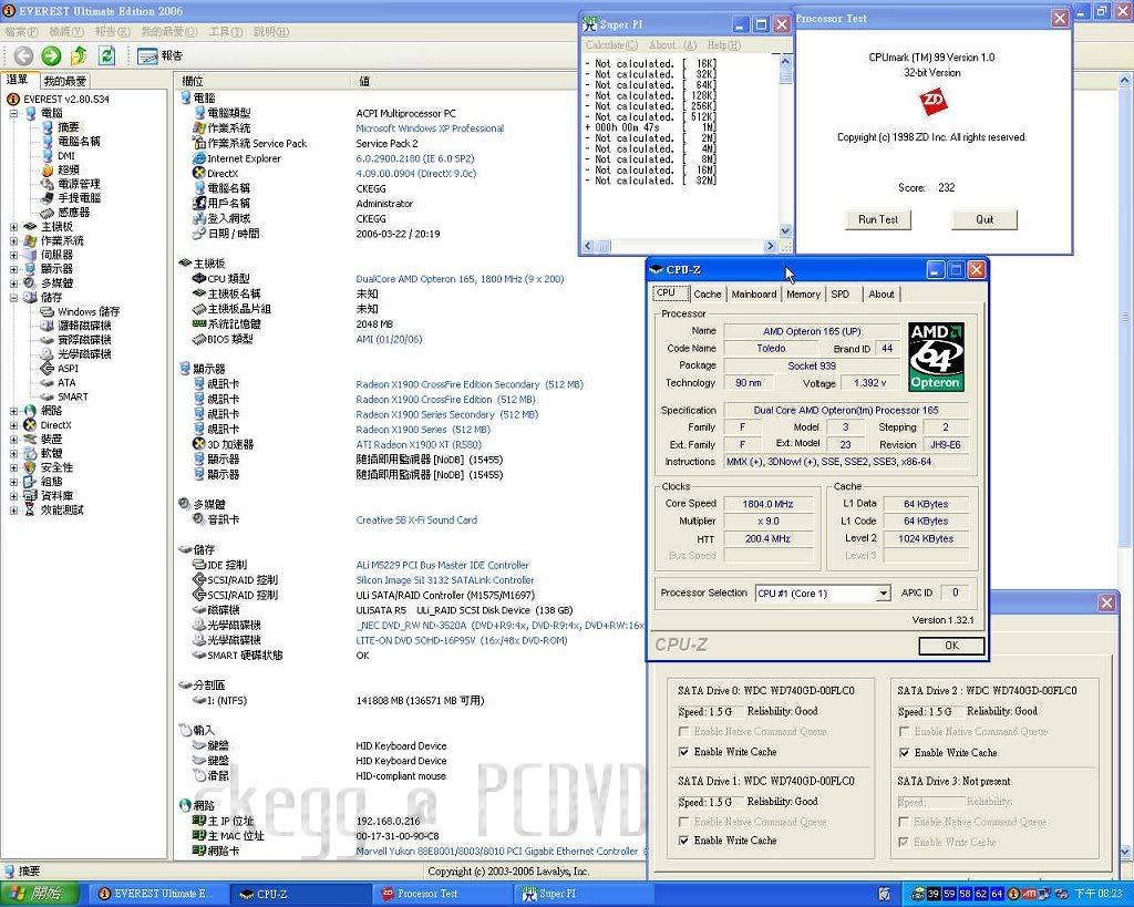 而催化劑方面, 新出的 Catalyst 6.3 版會令 CF 的副卡(一般卡) 當掉, 無法運行 CF, 東搞西搞後換成 6.2 版就正常了, 不知道是否是 ASUS 版子與 XPRESS 3200 晶片組的問題(BIOS 0133 說修正了類似問題但是還是一樣)?