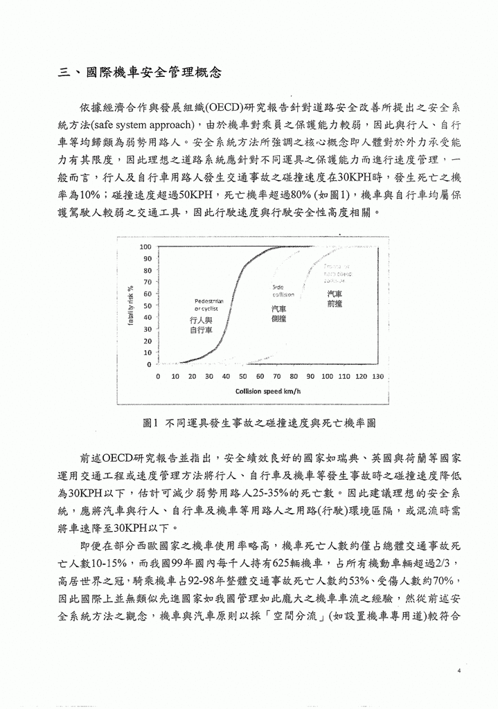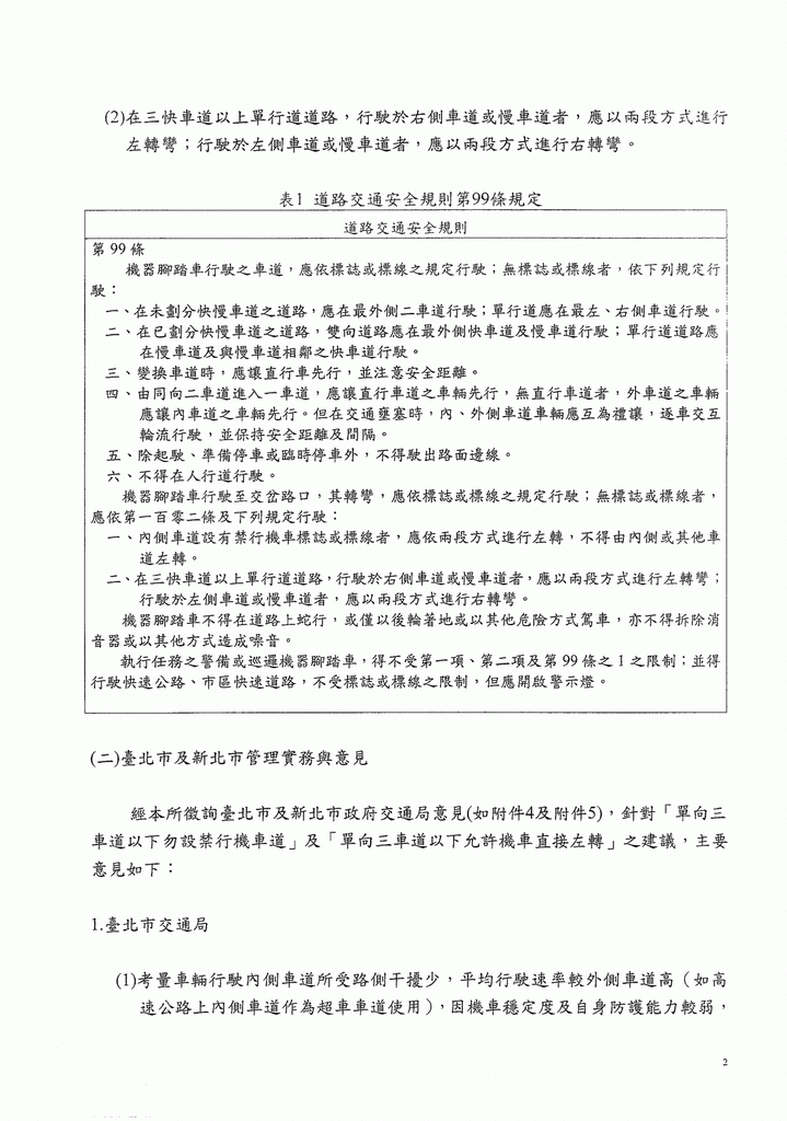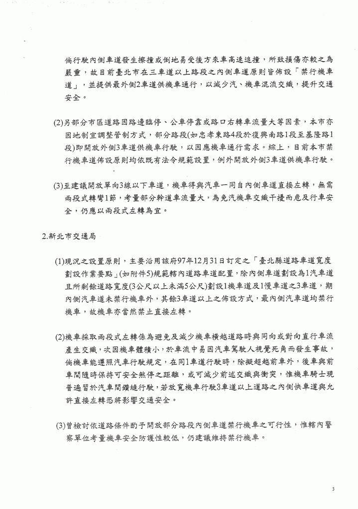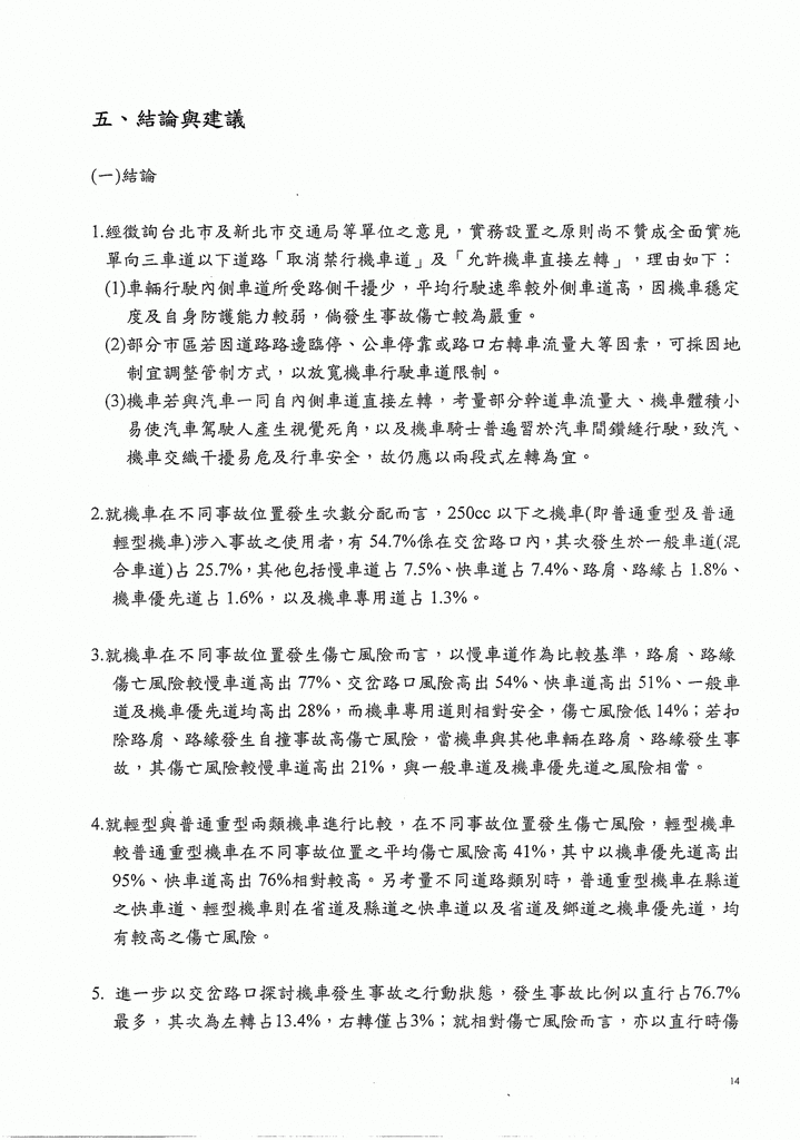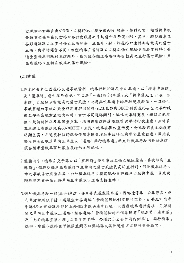 最後一張圖.....建議..... ….現階段若全面取消單向三車道以下道路禁行機車道,而允許機車行駛內側快車道,須審慎考量機車事故嚴重度增加之可能性 …..現階段亦不宜全面允許單向三車道以下道路直接左轉 |